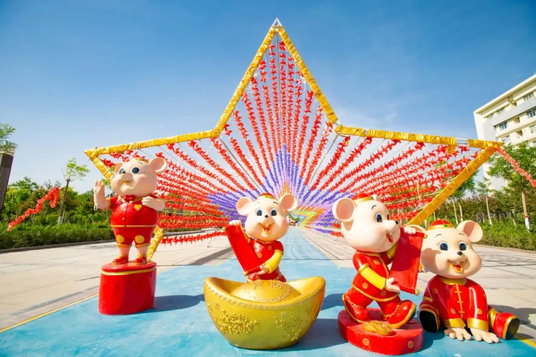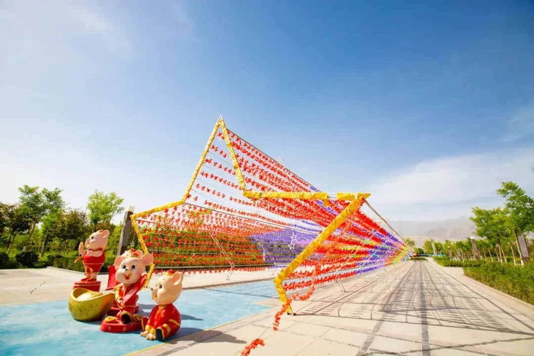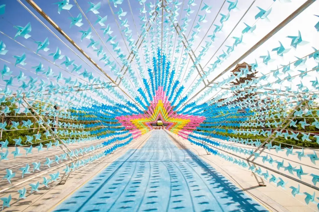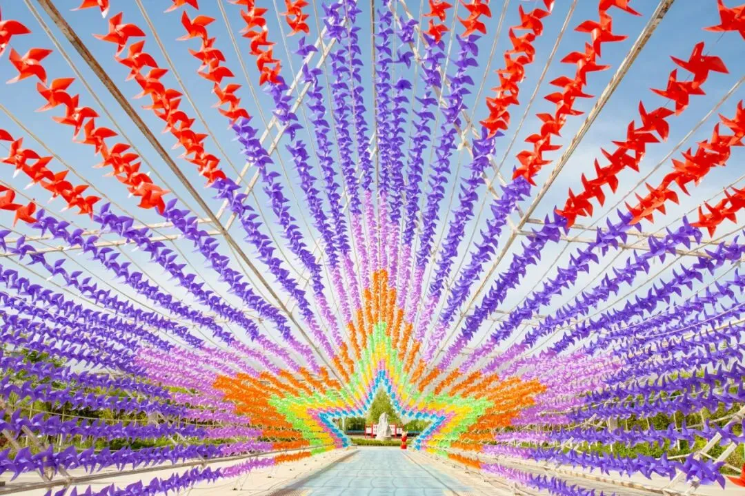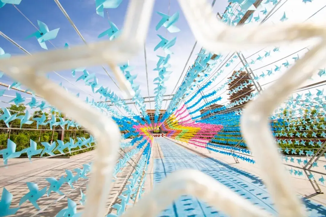 在这里 你可以尽情感受深厚的人文古韵 也可以享受浑然天成的生态风光 风吹风车转,车转幸福来 五角星形的七彩风车长廊 全长56米 近1.5万个彩色风车