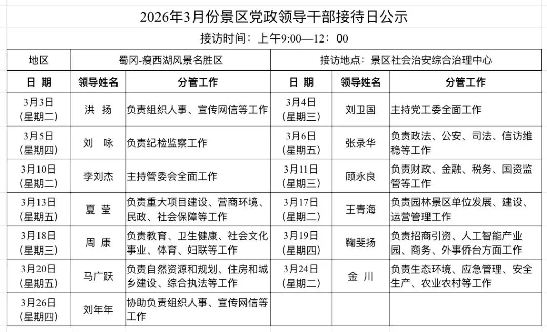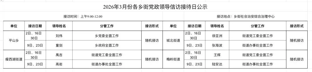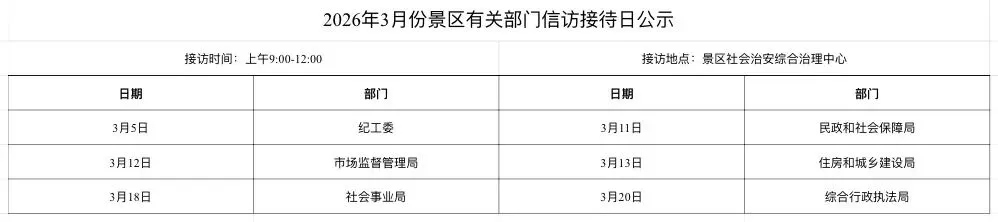 为进一步畅通信访渠道,方便群众反映诉求,现将2026年3月份景区及各乡(街)、有关部门党政领导干部信访接待日公示如下: