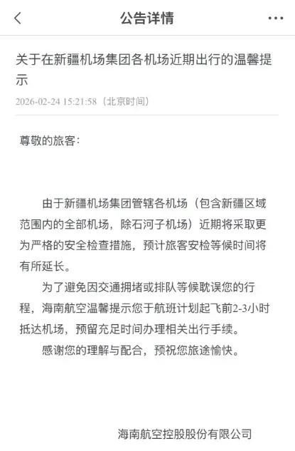 近日,海南航空官网发布"关于新疆机场集团各机场近期出行的温馨提示" 由于新疆机场集团管辖各机场(包含新疆区域范围内的全部机场,除石河子机场)近期将采取更为严格的安全检查措施,预计旅客安检等候时间将有所延长 为了避免因交通拥堵或排队等候耽误您的行程,海南航空温馨提示乘客于航班计划起飞前2-3小时抵达机场,预留充足时间办理相关出行手续