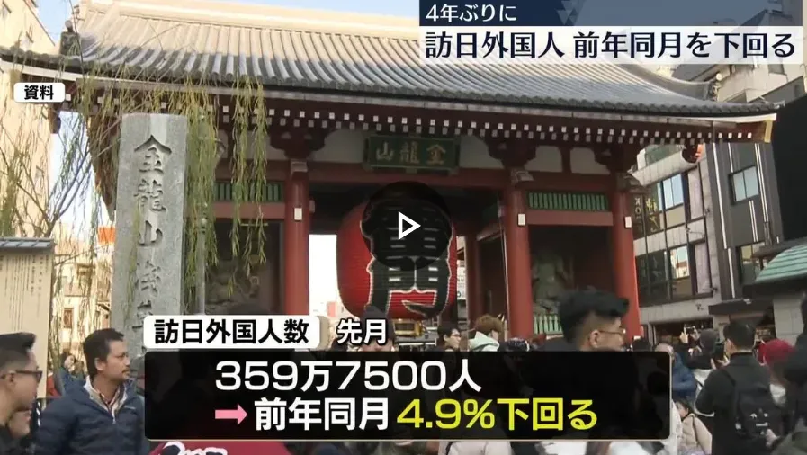 来自日本方面的数据,今年1月访日外国游客人数为359万7500人,同比下降4.9%。这是自2022年1月以来,时隔4年多时间首次出现单月负增长的情况