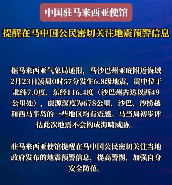 马当局初步评估此次地震不会构成海啸威胁。驻马来西亚使馆提醒在马中国公民密切关注当地政府发布的地震预警信息,提高警惕,加强自身安全防范