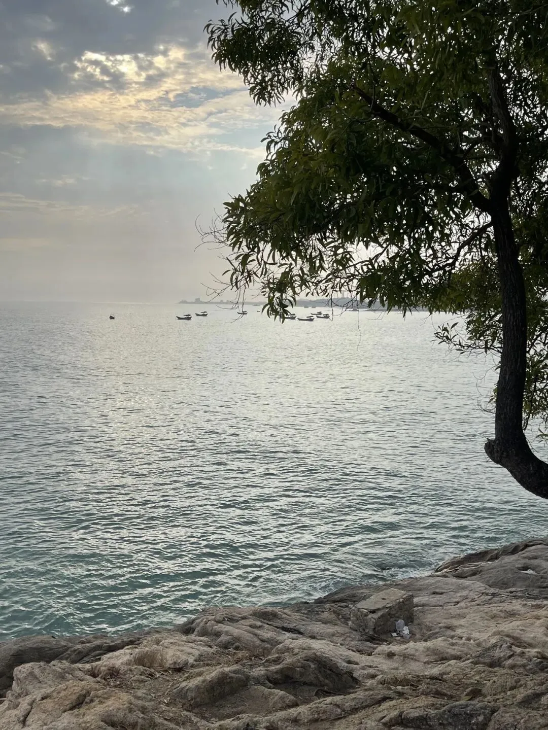 欣赏了捷胜沙角尾的麒麟虎狮表演后,我们到沙角尾海崖边,支起桌椅,泡茶,吹风、听涛、看海,时间就静悄悄地溜走,直到上弦月,挂在天上,木麻黄叶尖闪烁着黄昏落日之光,风起。