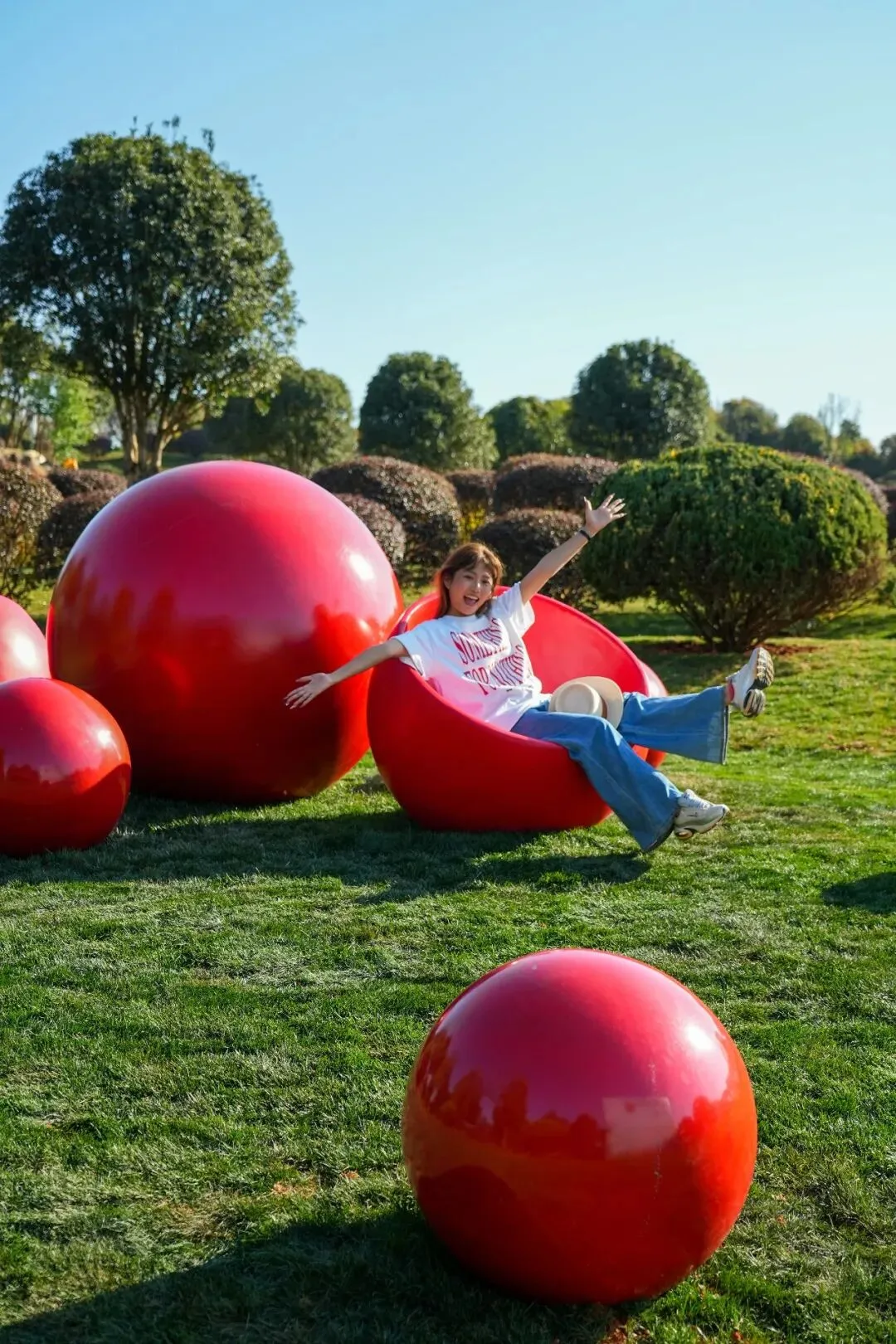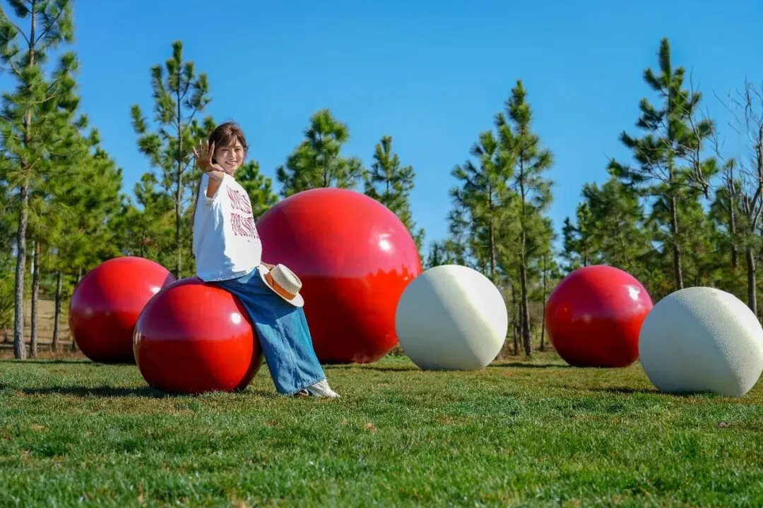 园子里藏着一些等待被发现的小心思 草坪上,红色和白色的圆球散落着 像巨人小孩玩累了丢下的弹珠