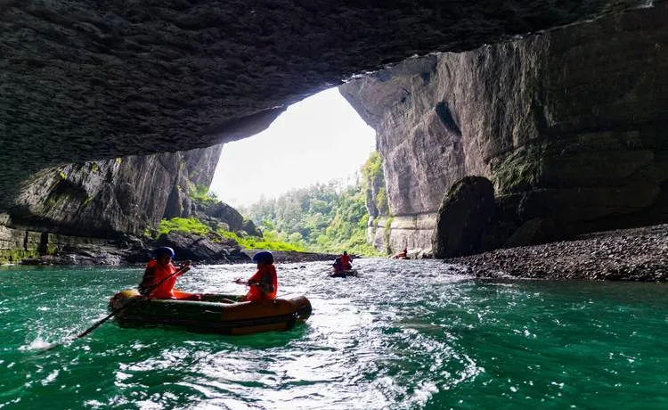 唐崖河是咸丰的水文担当,这条河从大山深处流出来,一路切开石灰岩地层,切出一条峡谷,河道两边都是几十米高的绝壁,水流到这里速度快,落差大,所以河段特别适合漂流。但唐崖河的漂流跟那种纯玩刺激的漂流不太一样,这条河的水质好,清得能见底,河床上的石头、水草看得一清二楚,漂在上面你能感觉到水的力量,那种推着你往前走、由不得你控制的力量,这才是自然状态下河流该有的样子。