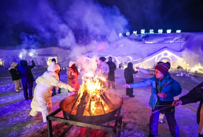 更绝的是头山村。这里把冰雪资源和民俗底蕴玩出了新高度——16座融入非遗元素的霍比特雪屋散落在雪原上,长鼓造型、象帽点缀,像从童话里长出来的。屋里,全景“放山文化”体验同步上线,寻参、挖参、祭山——把东北的老传统做成了人人能上手的新鲜事;屋外,朝鲜族传统冰雪竞技正热闹着,雪地上满是欢笑声。