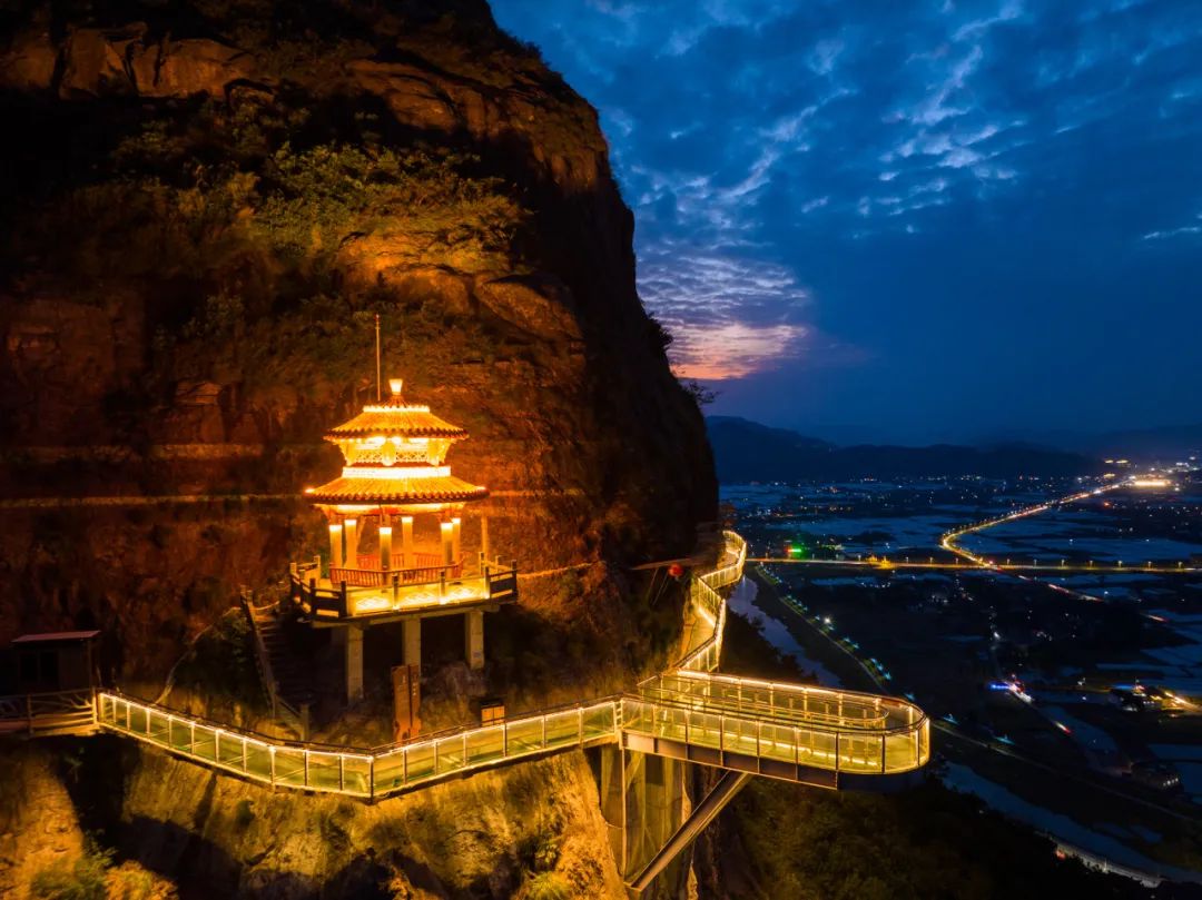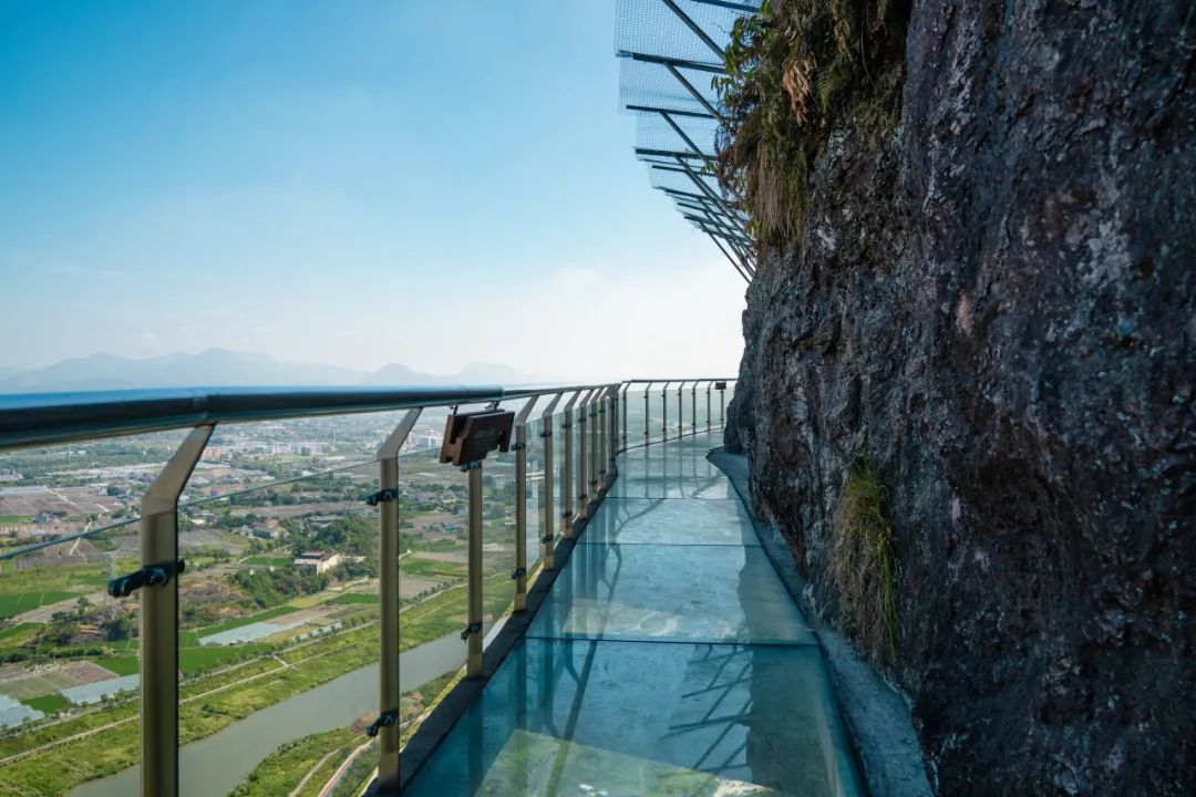 流石山玻璃栈道顺应山体而建,呈环形状,悬挂于半山腰,长约140米、宽1.5米,置身其中,可一览灵溪、藻溪自然风光及田园景色,体验“空中行走”。