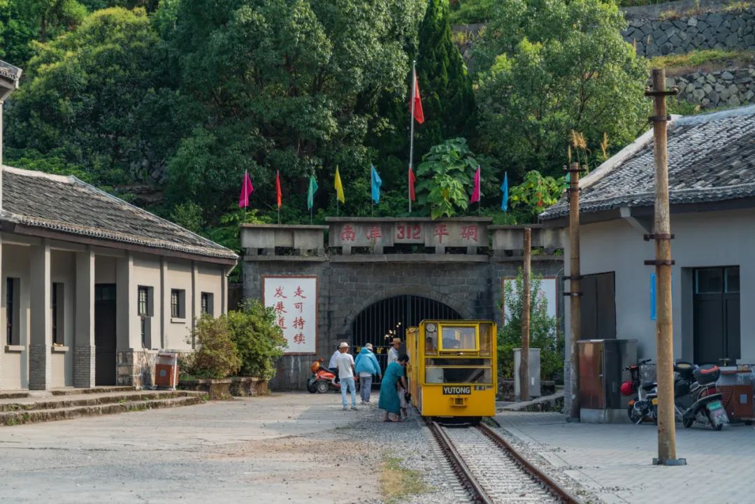 “南垟312平硐”处于第四层,矿硐内部有矿硐会议室、主井绞车房和270提升主巷道等历史遗存。矿硐前面的矾矿主题公园铁轨上,停着一列小火车。小火车两边坐落着一排排古朴的工农宿舍,这场景仿佛把我们带入了50年代初,眼前浮现矾矿工人们忙碌的身影。