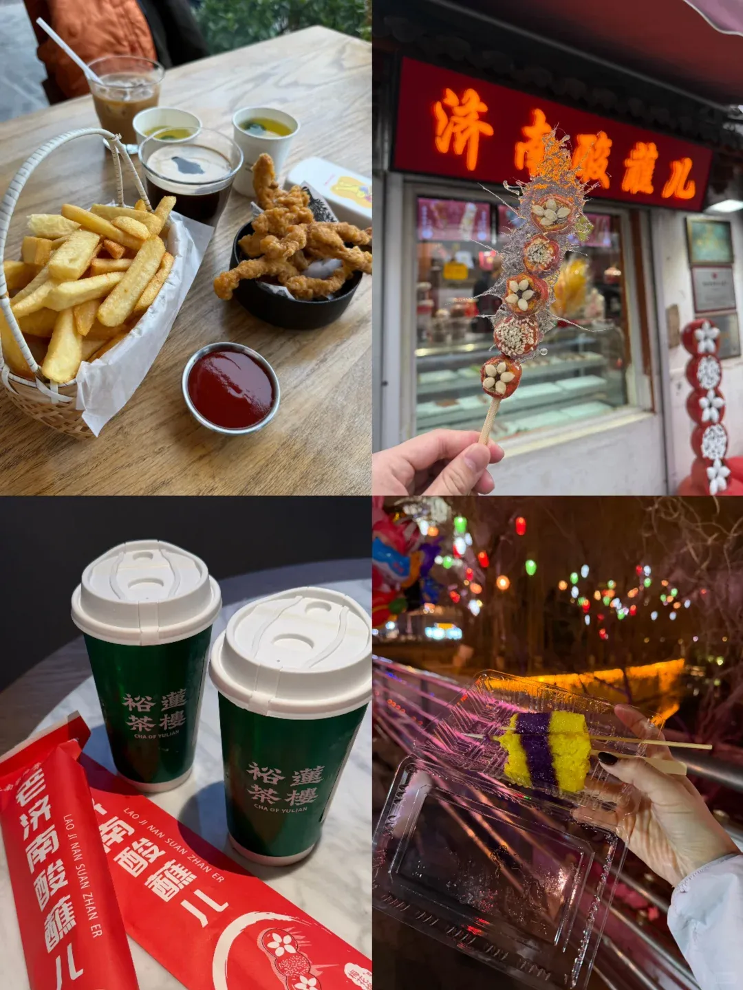 美食推荐:路边的泉水酸奶(瓷瓶装,稠厚醇香)、酸蘸儿(山楂夹豆沙裹冰糖,酸甜解腻)、泉水油茶(暖乎乎,驱散凉意),都是老济南特色,可浅尝辄止,留着肚子去芙蓉街吃正餐。