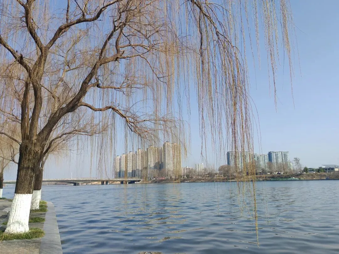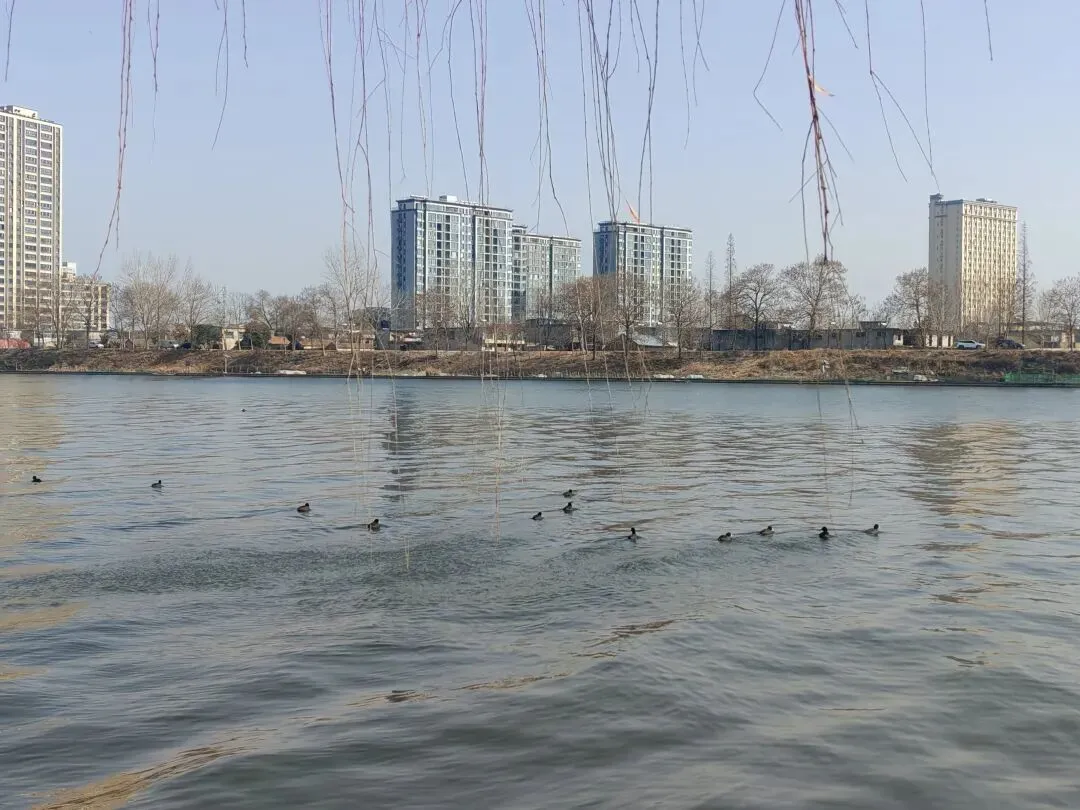 河道很宽,碧波荡漾,河水很清,垂柳依依,三两四五六七八九野鸭游荡。