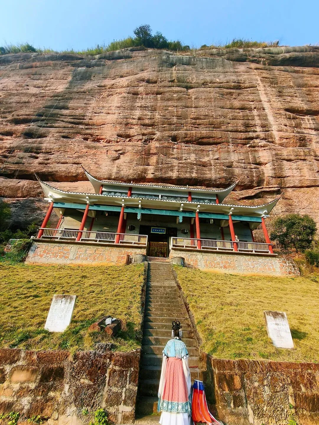 寺庙仅一座建筑,山门、佛殿、配房,红柱灰瓦,飞檐翘角,倚赤岩绝壁。