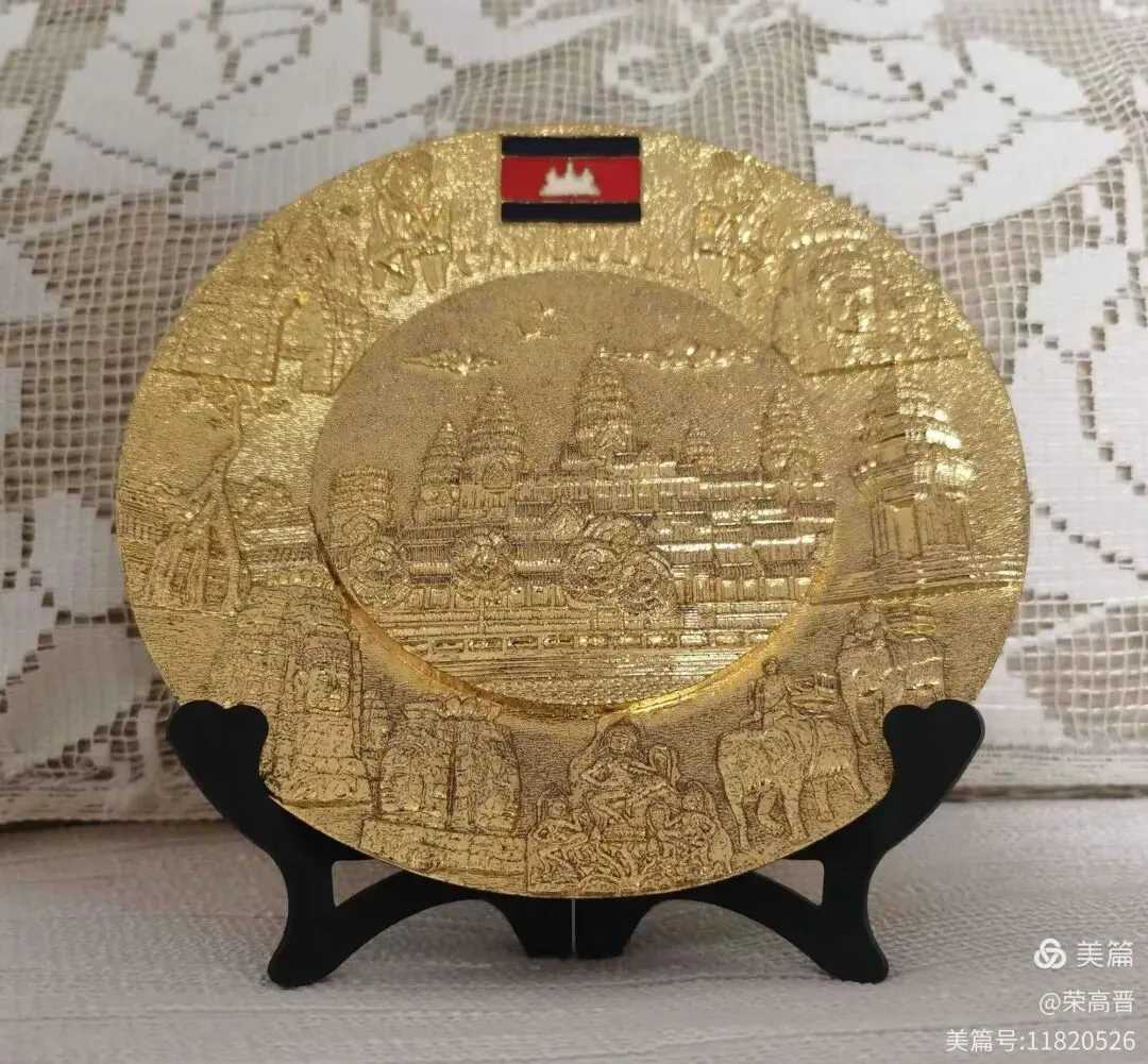 接下来去的是柬埔寨。要说起来柬埔寨的红木比越南的更好更实用,就连我们旅游期间住的宾馆所有家具用品都是实实在在的硬质红木。当然最能反映柬埔寨国家旅游地理风貌的一定是吴哥窟,所以这趟柬埔寨之旅的纪念品就是铸有吴哥窟景色的纪念盘和一个柬埔寨红木罐。