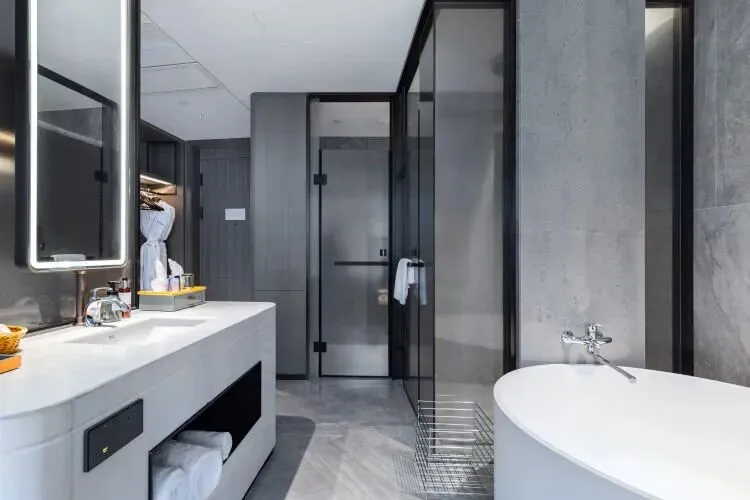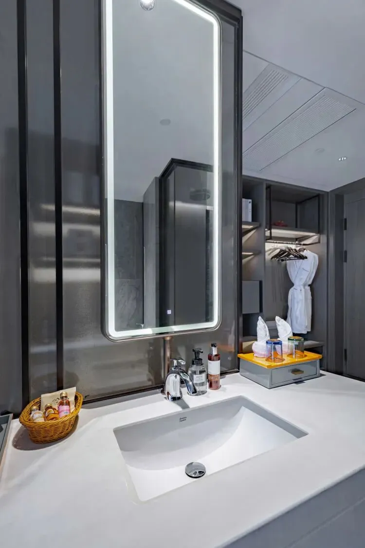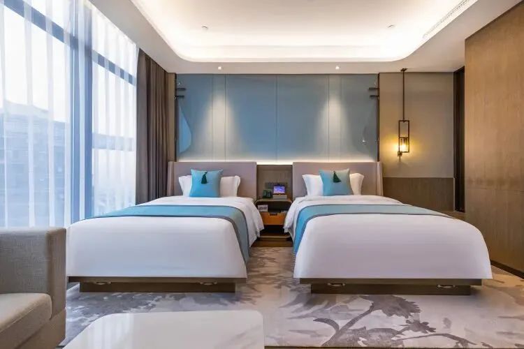 酒店主体设计为新中式极简轻奢风,搭配自主入住系统、智能服务机器人、MI家智能客房控制系统等。