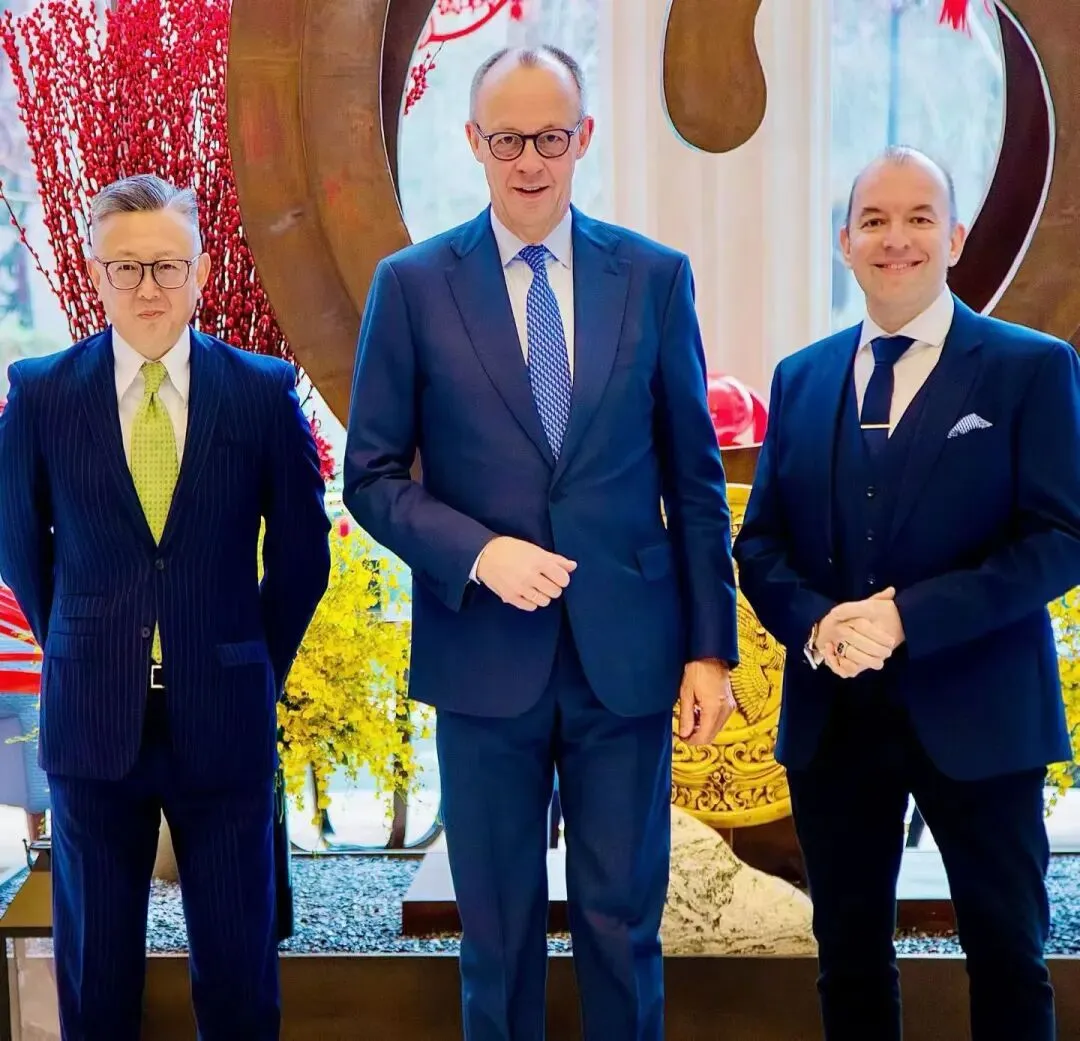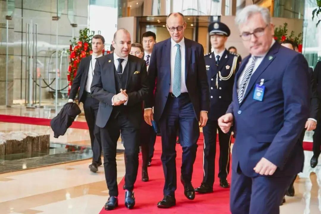 八、德意志联邦共和国总理(弗里德里希·默茨),他对中国进行正式访问期间与北京丽晶酒店会面。(同时他也住在北京丽晶酒店)[握手]