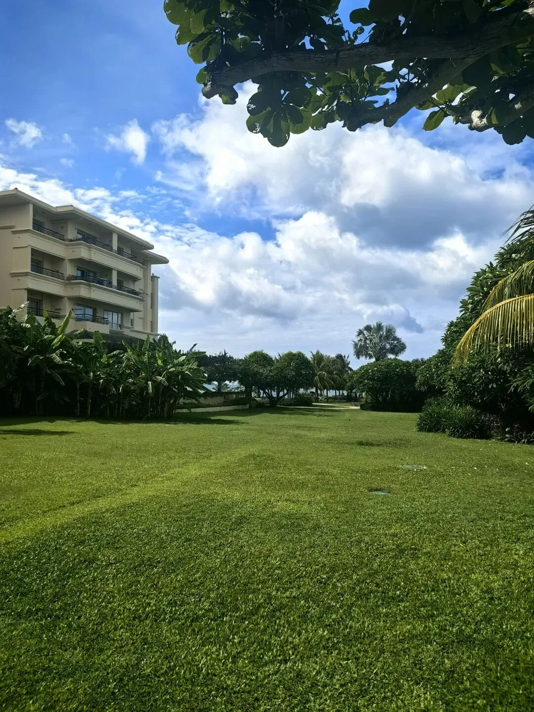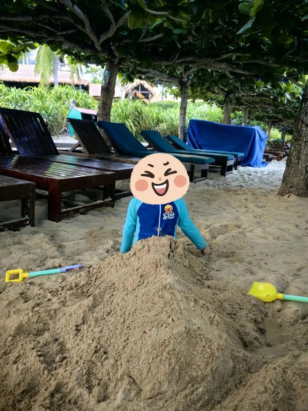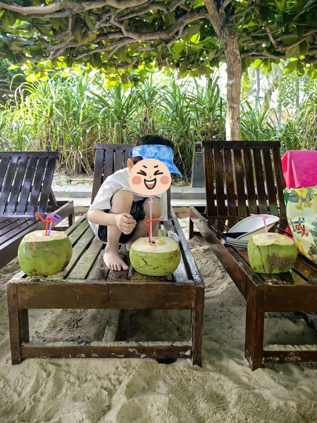 弟弟最爱沙滩,喝椰汁……可以玩一天。酒店有数量最多、覆盖最广的大叶榄仁树,树形像大平顶伞,遮阳极好,花园、泳池、沙滩边全是。这两天我们防晒做好,加上阴凉地方多,竟然没晒黑呢。