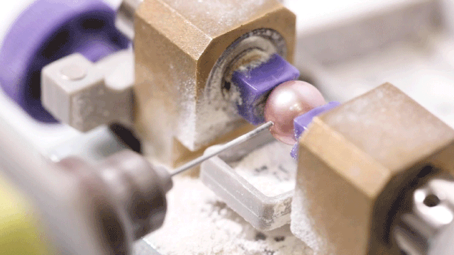 每一枚珍珠蚌里都有了不一样的惊喜,小心翼翼地取出里面的珍珠,仔细清洗。有的珍珠洁白无瑕,有的珍珠色彩斑斓,每一颗都独一无二,绝对让人爱不释手。 珍珠取出后挑选后 将进行打孔操作 在珍珠上钻出一个细小的洞 便于穿入引线 再挑选出自己心仪的首饰款式 在老师的帮助下制作一个专属于自己的饰品