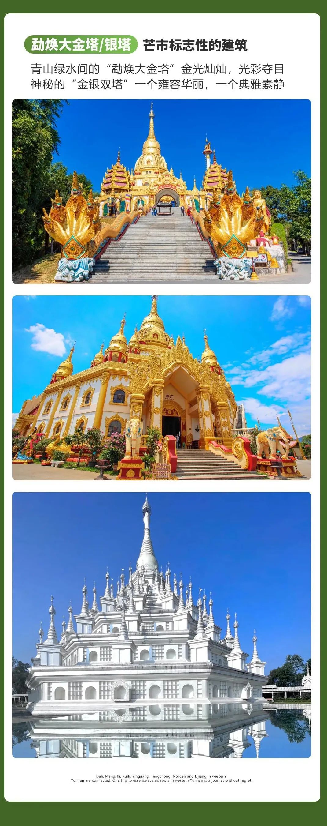 后自行前往【勐焕银塔景区】,芒市银塔,位于雷崖让山之畔,与芒市孔雀湖生态旅游景区紧邻,是芒市地区一个十分醒目非常结粒的南任一所部做教标志性建筑,以宗教文化体验、旅游观光、餐饮购物为主题,依托景区生态环境,突出佛教文化,通过建设佛学院、弥陀胜境和塔林等,使之成为底蕴丰厚、博大精深的南传佛教文化、少数民族优秀传统文化的展示区。门票需自理