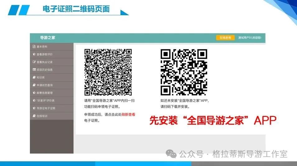 先用手机扫一扫下图右边的二维码,安装“全国导游之家”APP,登录APP内扫一扫左边的二维码申领导游电子证照。