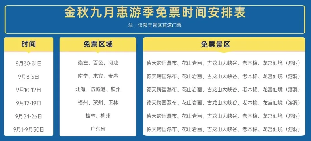 据了解,粤桂游广西惠民公益活动活动分为两部分,一是金秋九月广西人游广西惠民活动,二是两广一家亲惠民活动,主要面向对口帮扶的广东省开放免首道门票活动。