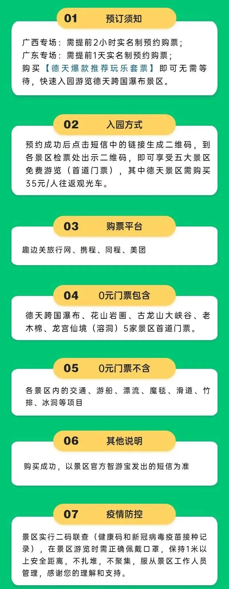 市民需提前2小时实名制预约购票,可在趣边关旅行网、携程、同程、美团等购票平台预约,预约成功后点击短信中的链接生成二维码,到各景区检票处出示二维码即可享受中旅花山岩画、龙宫仙境、古龙山大峡谷、德天老木棉等五大景区免费游览。