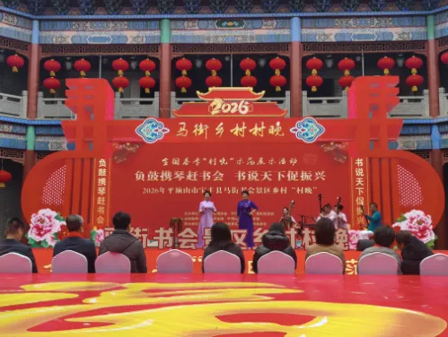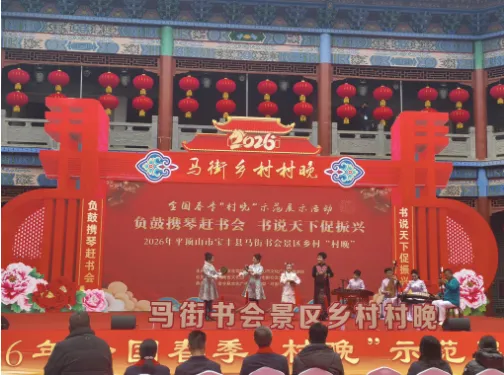 负鼓携琴赴盛会,曲艺传情促振兴。2月27日下午,全国“四季村晚”示范展示活动——“负鼓携琴赶书会 书说天下促振兴”2026年宝丰县马街书会景区乡村“村晚”在中国曲艺交易中心圆满举行。这场由中国文化馆协会、平顶山市文化广电和旅游局主办,宝丰县文化广电和旅游局、马街书会景区承办的文化盛宴,以曲艺为魂、年味为韵,深度融合千年非遗底蕴与乡村振兴内涵,让传统文脉与时代发展同频共振,为现场观众呈现了一场兼具观赏性与文化性的视听盛宴。