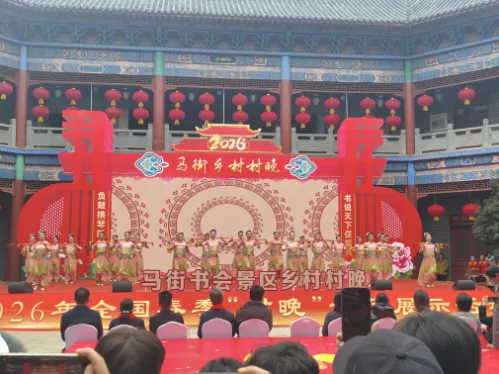 演出现场座无虚席、暖意融融,来自四面八方的群众齐聚一堂,满怀期待共赏精彩演出,现场氛围热烈而浓厚。《春舞欢腾迎书会》率先登场,演员们身着靓丽服饰,以绚丽灵动的舞姿紧扣马街书会主题,明快的节奏、饱满的热情瞬间点燃全场,台下掌声、欢呼声此起彼伏,为整场“村晚”拉开了热闹的序幕。