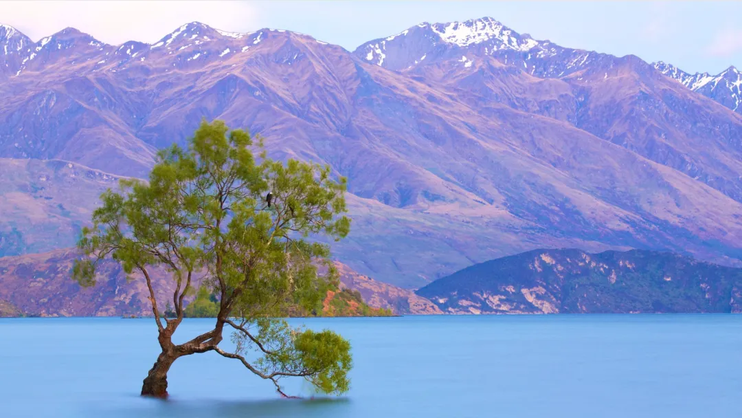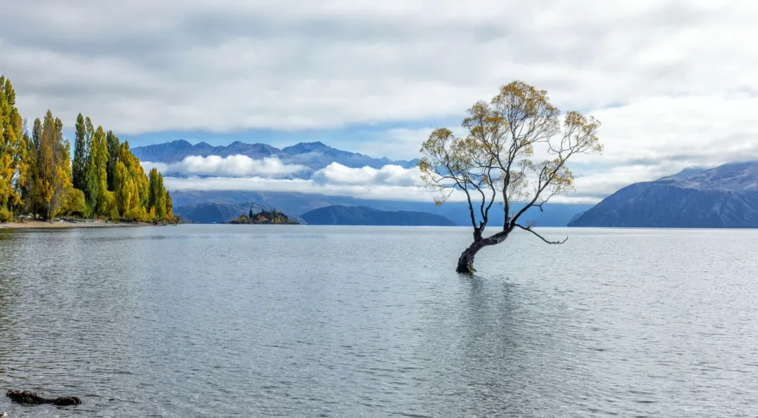 瓦纳卡湖最独特的风景,当属湖中的那一棵孤柳,它可能是新西兰出镜率最高的树了,一年四季,这棵“湖中孤树 (That Wanaka Tree) ”也美成了令人惊艳的样子。