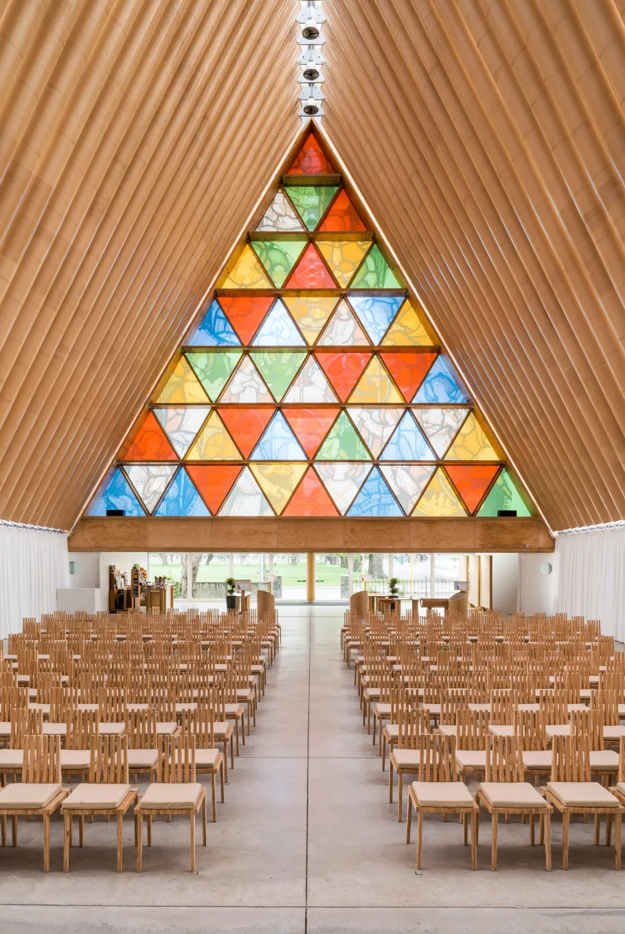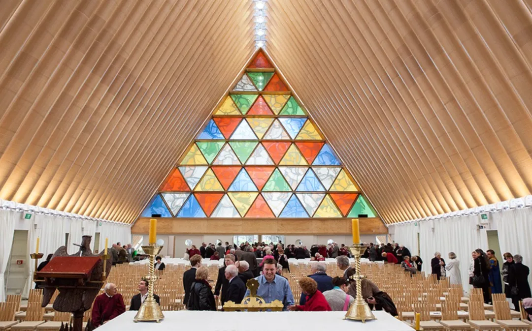 这座临时大教堂预计使用寿命为50年。196根等长的纸管,巧妙构成了教堂的主体结构!“罗伊兹之窗”由木制格栅与玻璃组合而成,阳光透过窗户,形成梦幻般的光影效果。