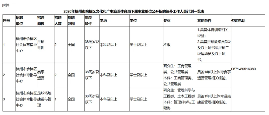 本次计划公开招聘编外工作人员5名。具体招聘单位、岗位、人数、条件和其他要求及咨询电话等详见《2026年杭州市余杭区文化和广电旅游体育局下属事业单位公开招聘编外工作人员计划一览表》。