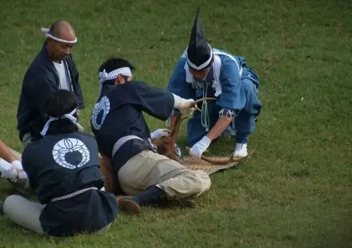 全世界只有日本有的切鹿角祭典源自江戶時代,當時為了避免公鹿發情傷及人類,每年的秋季當鹿角成熟時,在春日大社境內的「鹿苑」舉辦切鹿角祭典。因奈良的鹿是春日神的使者,祭典相當神聖,由多位勢子追趕並制伏公鹿,再由神官進行切鹿角儀式。