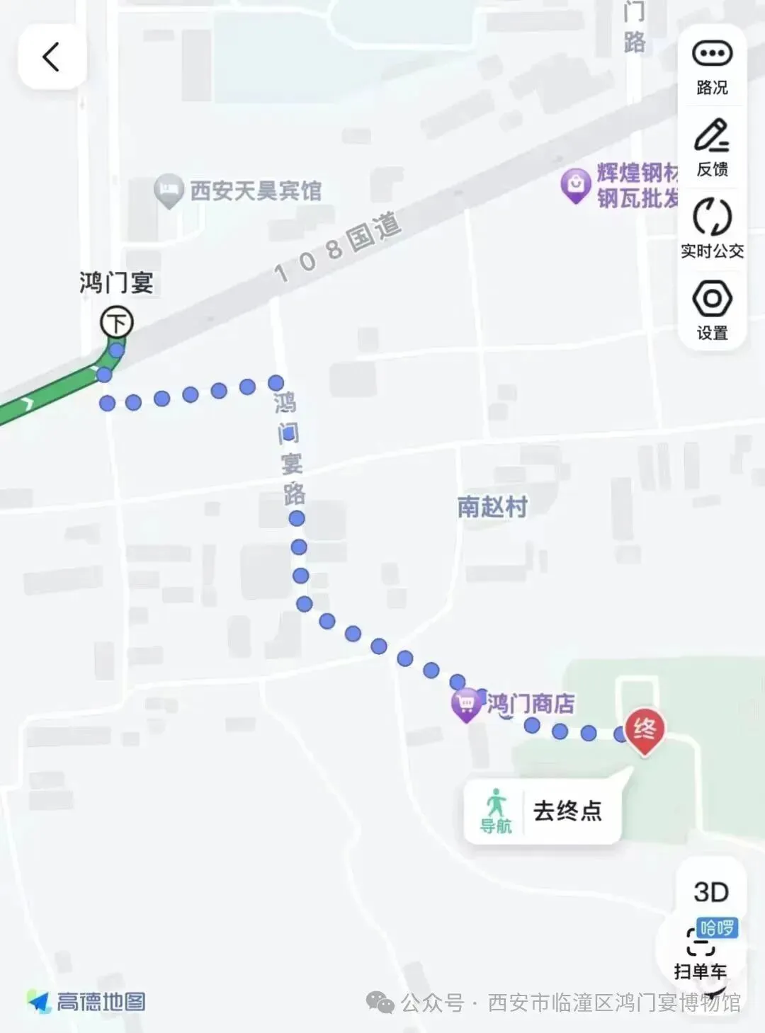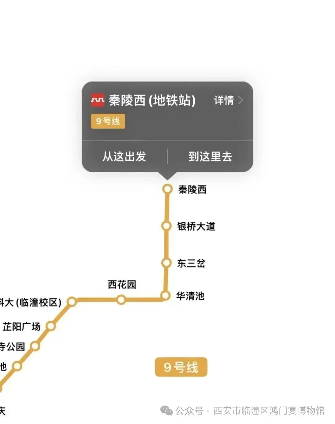 地铁9号线乘坐至秦陵西站于D东北口出站,出站后转乘617路、301路、临渭专线至鸿门宴博物馆。