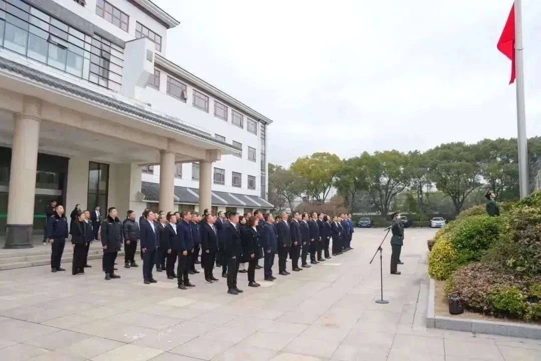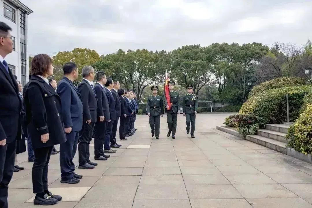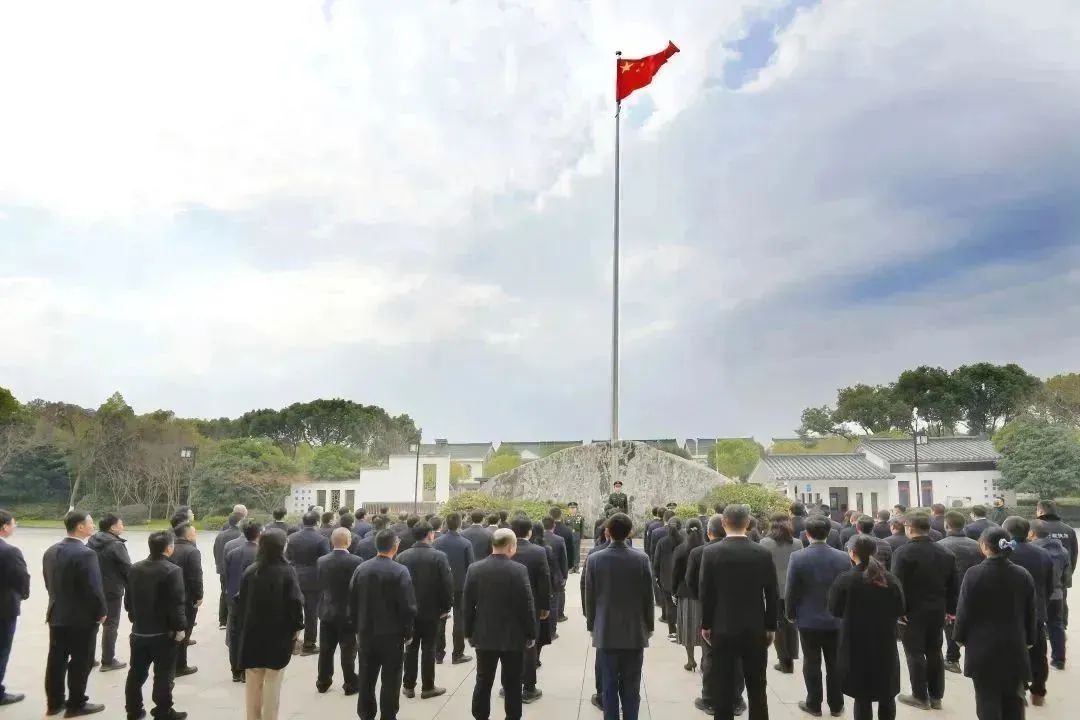 在嘹亮的国歌声中,五星红旗缓缓升起,全体人员庄严肃立,行注目礼。