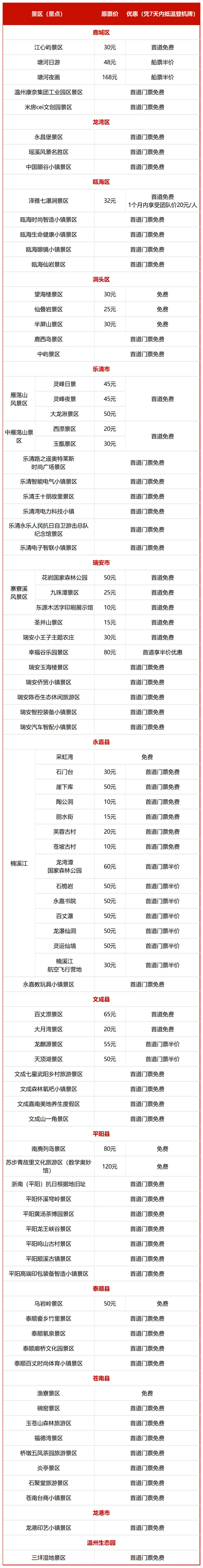 “一张机票游温州”全市景区(景点)优惠名单 图源 温州发布