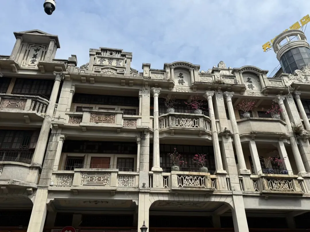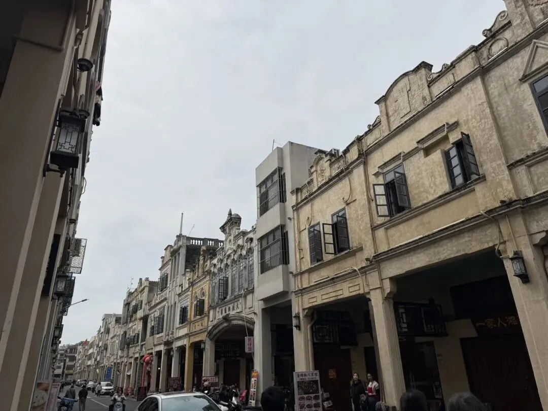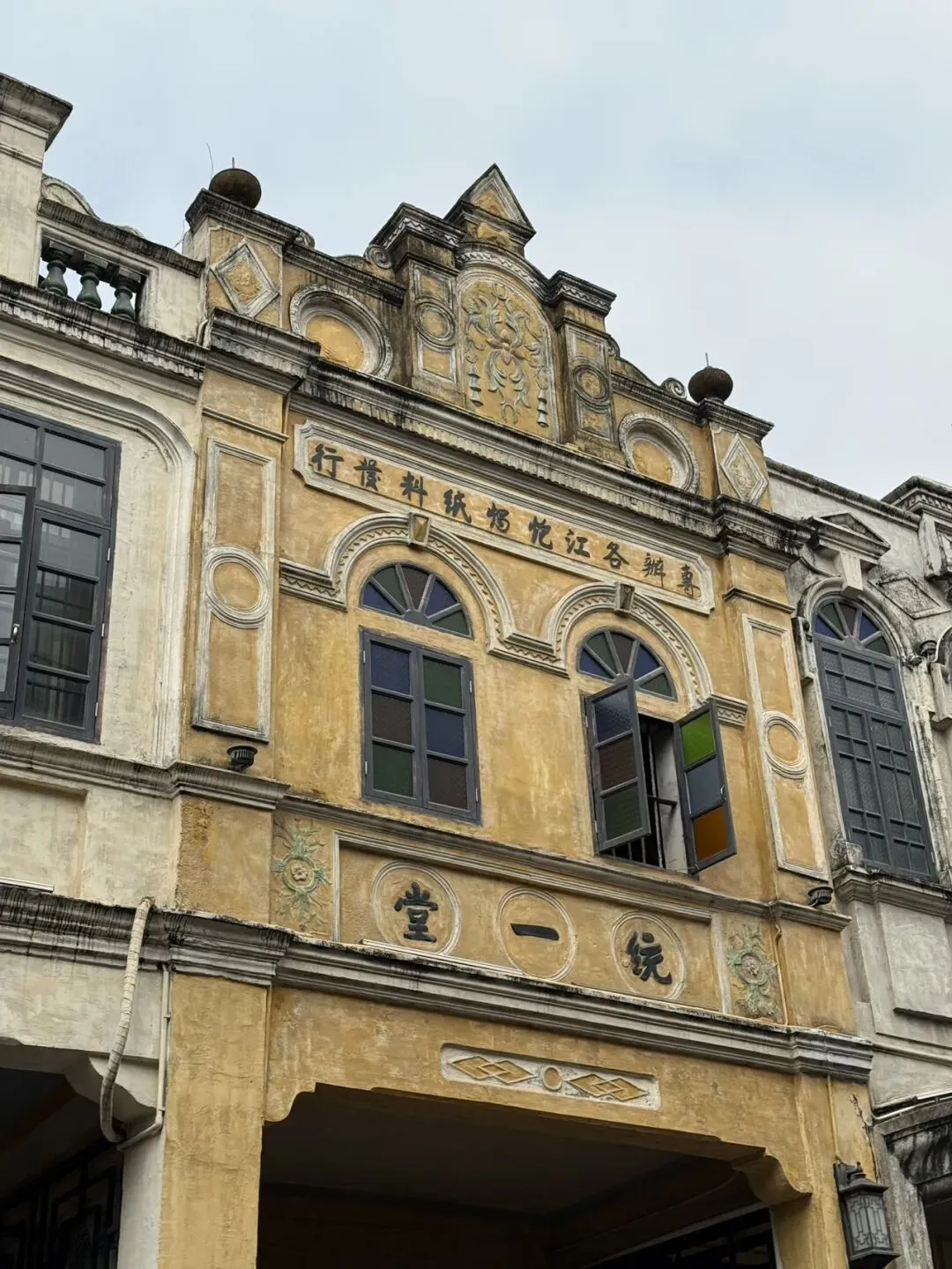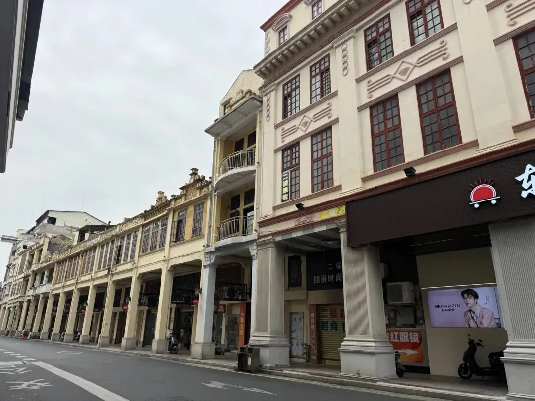 这里的骑楼至今保留着下铺上居的传统格局,一楼是沿街商铺,二三楼仍有本地居民居住。骑楼廊下藏着许多历经岁月的老店,有的合作社式商铺已经营七八十年,满是童年回忆里的烟火气息。傍晚时分,二三楼的阳台摆着绿植盆栽,晾着日常衣物,浓郁的生活气息从每一扇窗里流淌出来。百年建筑窗户偏小,光线柔和,虽带着一丝旧时光的沉静与内敛,可当你站在连绵不绝的骑楼廊下,依旧会被这份恢弘震撼,仿佛看见一幅侨乡连接世界、心系故土的无声历史画卷。街区规模极大,随意闲逛、转角都有新风景,逛到最后甚至会产生审美疲劳,更能直观感受到这片建筑群的磅礴气势。