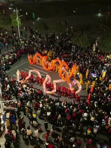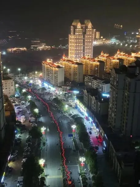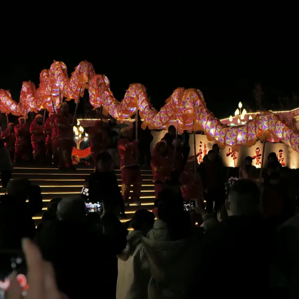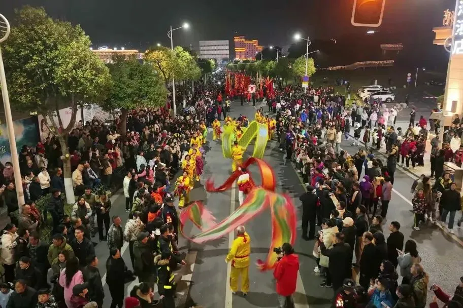 傍晚跟随龙狮队伍加入巡游狂欢,队伍从岭秀湖北广场出发,沿岭秀湖街→招贤大道→磨盘山南路→八面山路行进,最终抵达云端索道下站。沿途彩灯闪耀、龙狮起舞、锣鼓喧天,将新春氛围推向高潮,夜游氛围感拉满!