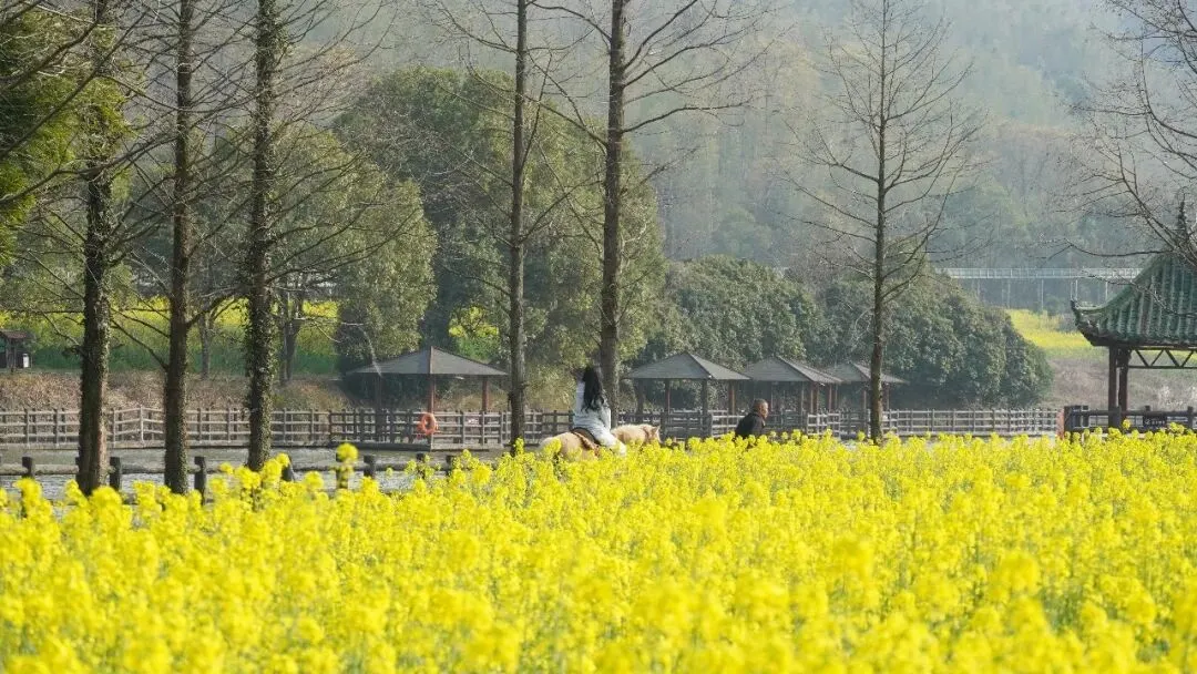 梅岭标志性景区,主峰形似雄狮,泮溪湖、飞云渡、天狮洞等步步有景。春日限定油菜花海已逐渐盛放,金黄花田从山脚蔓延至山间,与青山竹林相映成画,微风拂过花浪翻滚,清香四溢,正值观赏期!