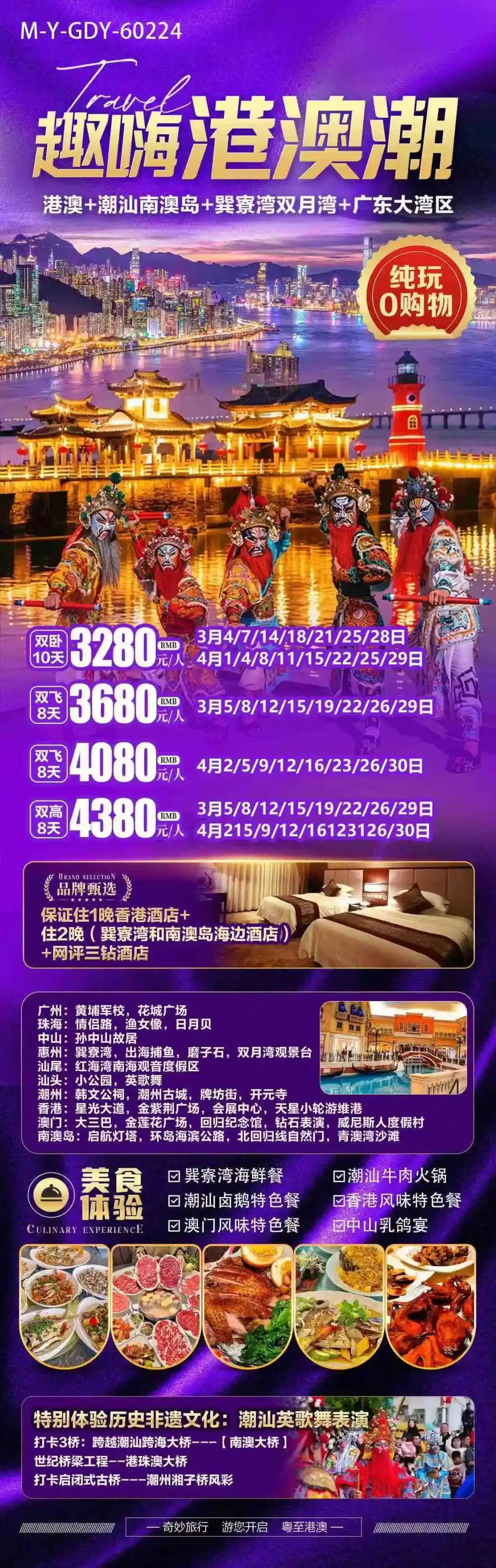 🥳特别赠送:湘子桥上桥体验+巽寮湾渔船出海+欣赏潮汕英歌舞表演+《天星小轮》小渡轮游维多利亚港+澳门银河钻石灯光秀,威尼斯人度假村