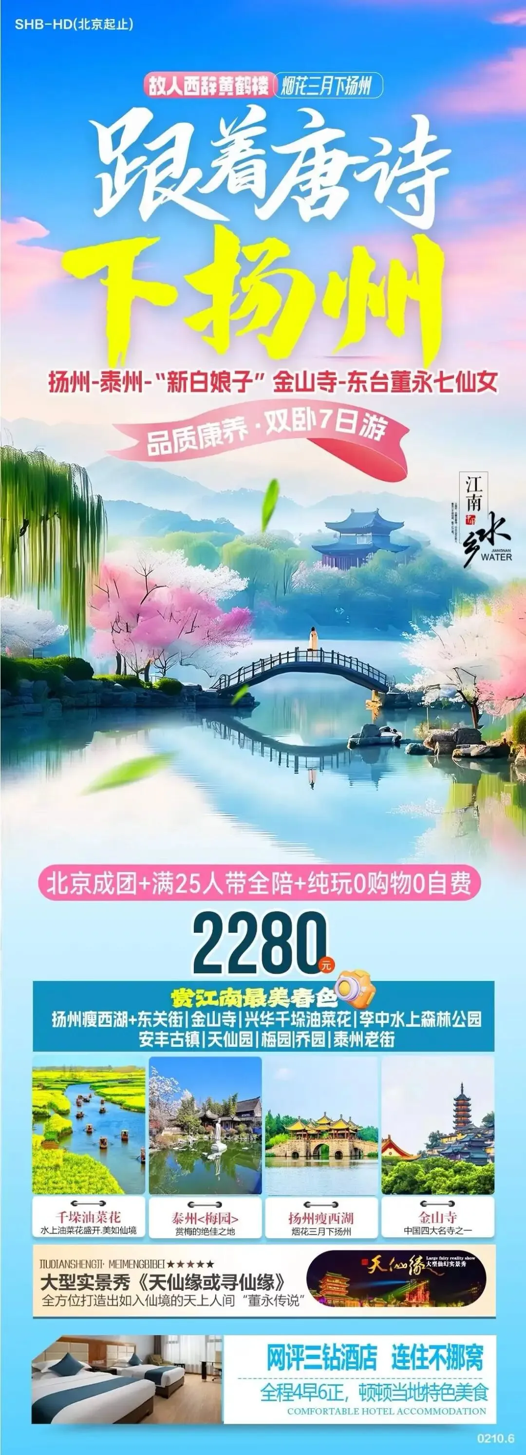 ✔扬州瘦西湖✔千垛油菜花✔李中水上森林✔金山寺✔乔园.梅园✔西津渡✔东关街✔天仙缘✔安丰古镇