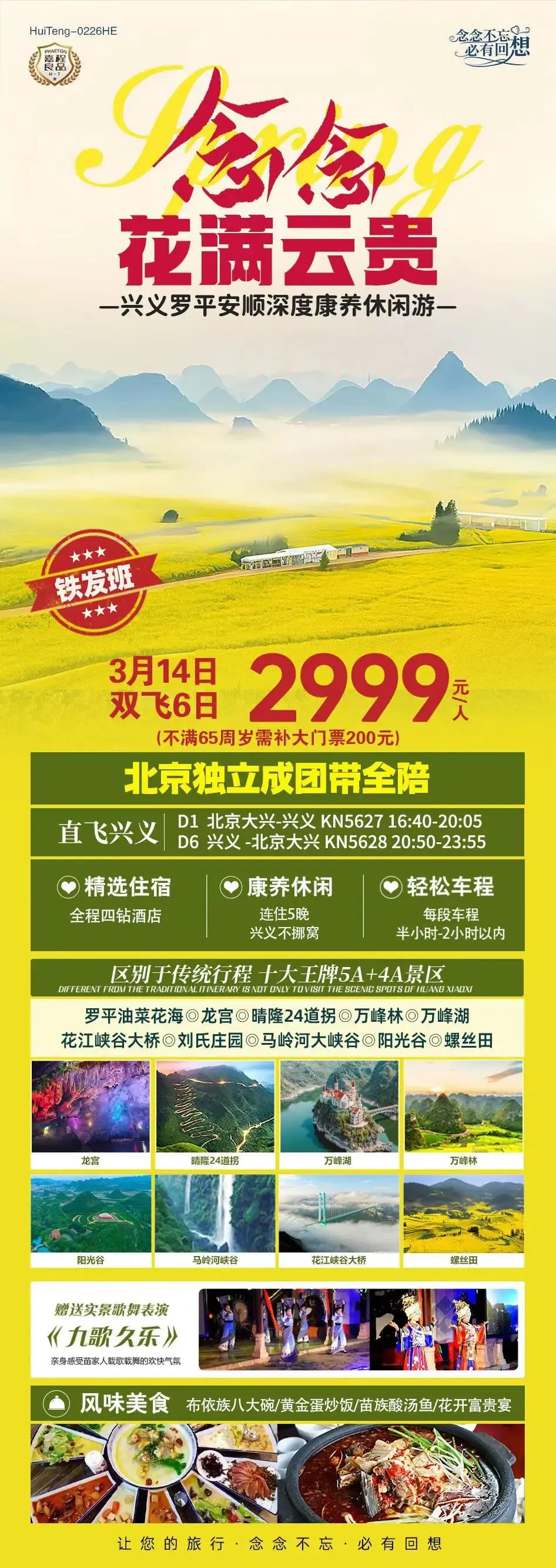 ✅北京大兴直飞兴义 + 云南罗平双飞 6 日赏花康养休闲游