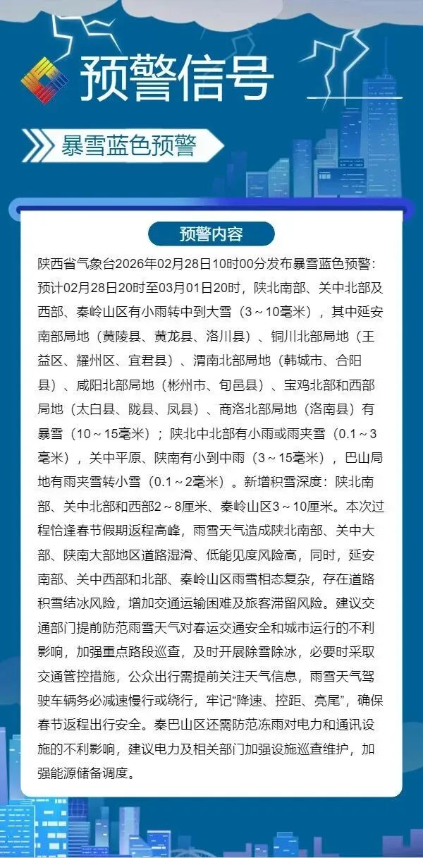 预计02月28日20时至03月01日20时,陕北南部、关中北部及西部、秦岭山区有小雨转中到大雪(3~10毫米),其中延安南部局地(黄陵县、黄龙县、洛川县)、铜川北部局地(王益区、耀州区、宜君县)、渭南北部局地(韩城市、合阳县)、咸阳北部局地(彬州市、旬邑县)、宝鸡北部和西部局地(太白县、陇县、凤县)、商洛北部局地(洛南县)有暴雪(10~15毫米);陕北中北部有小雨或雨夹雪(0.1~3毫米),关中平原、陕南有小到中雨(3~15毫米),巴山局地有雨夹雪转小雪(0.1~2毫米)。新增积雪深度:陕北南部、关中北部和西部2~8厘米、秦岭山区3~10厘米。