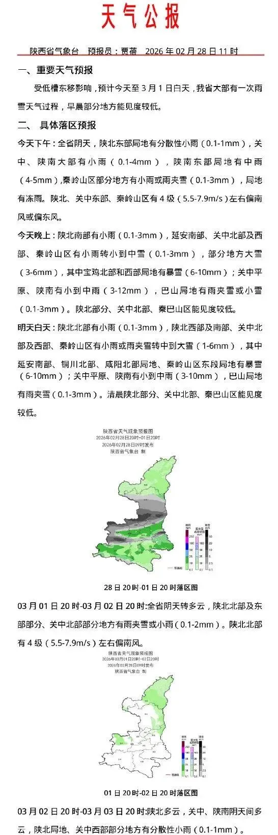 预计02月28日20时至03月01日20时,陕北南部、关中北部及西部、秦岭山区有小雨转中到大雪(3~10毫米),其中延安南部局地(黄陵县、黄龙县、洛川县)、铜川北部局地(王益区、耀州区、宜君县)、渭南北部局地(韩城市、合阳县)、咸阳北部局地(彬州市、旬邑县)、宝鸡北部和西部局地(太白县、陇县、凤县)、商洛北部局地(洛南县)有暴雪(10~15毫米);陕北中北部有小雨或雨夹雪(0.1~3毫米),关中平原、陕南有小到中雨(3~15毫米),巴山局地有雨夹雪转小雪(0.1~2毫米)。新增积雪深度:陕北南部、关中北部和西部2~8厘米、秦岭山区3~10厘米。