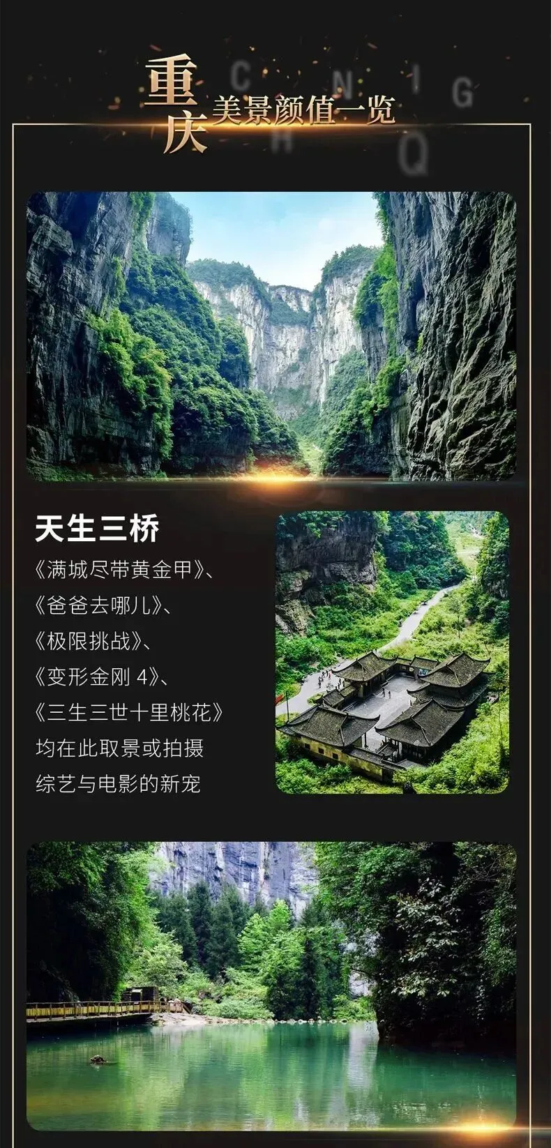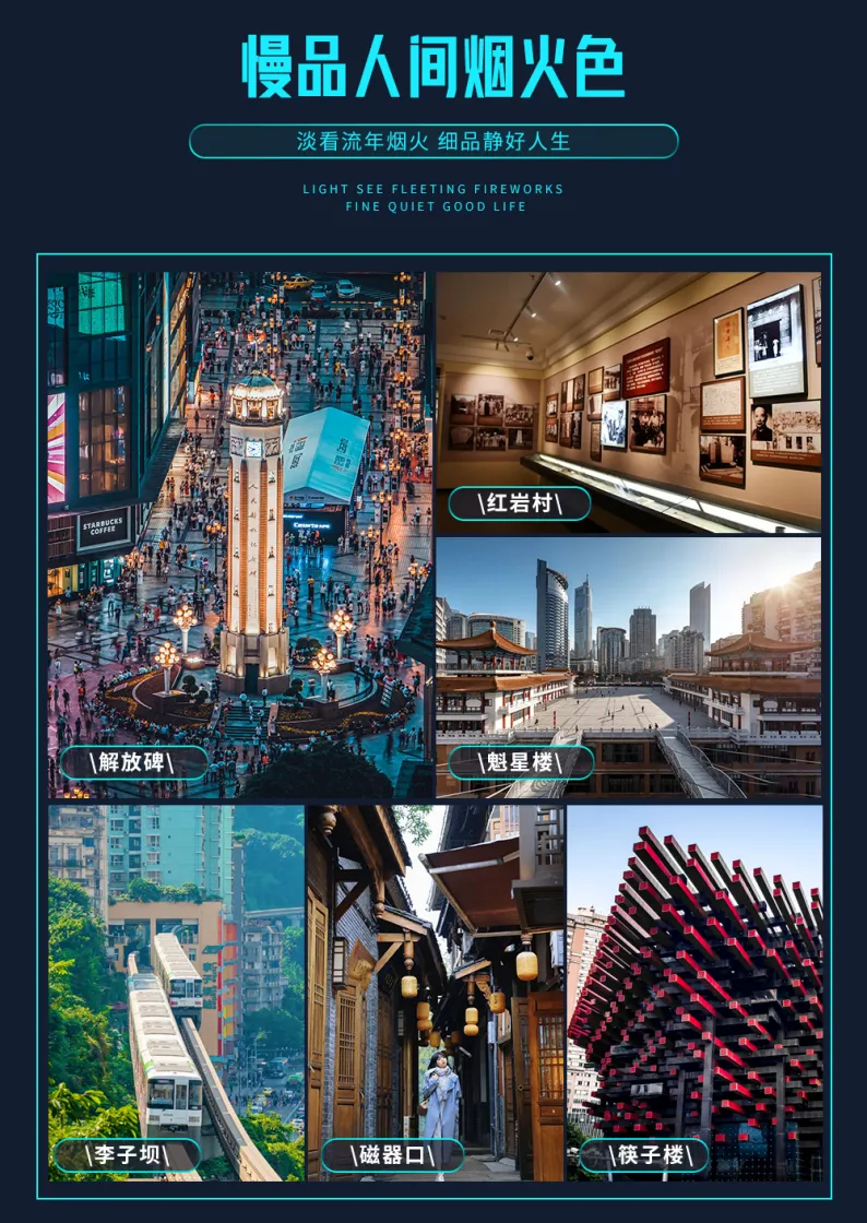 ③ 精华景点:武隆天坑地缝景区、宽窄巷子/锦里古街/春熙路/太古里等;重庆市区网红打卡-解放碑/洪崖洞/朝天门/磁器口古镇/李子坝轻轨穿楼/十八梯/魁星楼/白公馆/渣滓洞等打卡著名景点,旅途丰富。