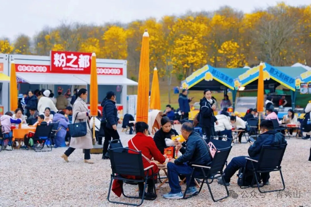 在黄花风铃园,市集已经热闹开张。美食摊位飘来阵阵香气,从地道小吃到春日限定甜品,每一口都是舌尖上的惊喜。