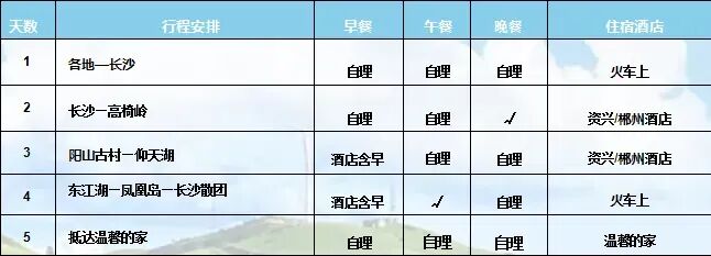 前往享用中餐后乘车返回长沙火车站,乘空调火车硬卧返程,结束愉快旅程! 05 温馨家园 早抵达温馨家园 服务标准 【交通】:郑州到长沙往返空调火车硬卧,当地旅游大巴保证一人一正座(根据实际出团人数定车型,10人及以下用普通车,安排师傅兼导游)。 【住宿】:携程3钻酒店(预备四星)(标准双人间,如需安排单间,请报名时提前告知)确保每人每晚一床位,如遇单男单女时,旅行社征得游客同意后拆分夫妻(或者在条件允许下拼房)。如无法安排时,游客自愿现补单房差。 【餐饮】:含2早2正(酒店含早餐,正餐10人一桌,不用不退),导游会根据游客人数安排所匹配菜的种类多少。 【门票】:打包项目:(以上景区门票均为旅行社优惠打包项目,不游不退任何费用,无长者门票优惠); 【导游】:中文持证优秀导游服务。单团9人及以下不安排单独导游服务师傅兼导游 【保险】:建议游客自行购买旅游意外保险,如出现意外摔伤等需进行赔偿处理,将按保险公司相关条款进行赔付。除此以外旅行社不再另做任何赔付。 【儿童】:儿童只含车费、餐费、导服、综费;门票请按身高在景区自理。