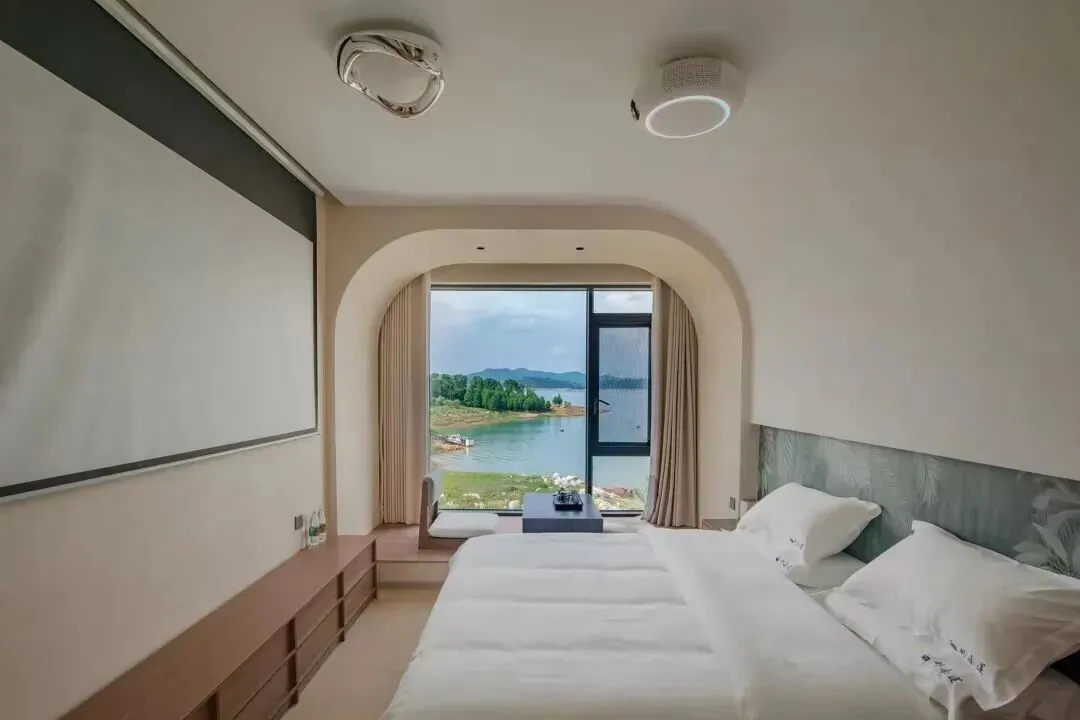 民宿拥有多种房型,每一种都独具特色,让人眼前一亮 。房间内的布置温馨而浪漫 。柔软舒适的床正对着巨大的落地窗,透过窗户,东江湖的美景尽收眼底 。
