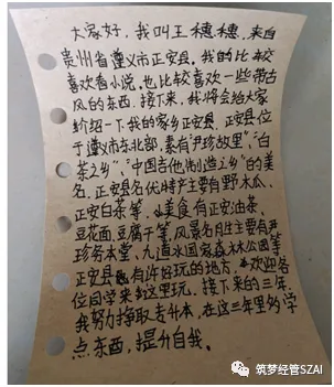 我性格比较外向,喜爱交友。希望接下来在苏农的这三年里能和同学们和睦相处,结下深厚的友谊。最后欢迎大家来到贵州游玩!