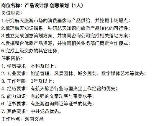 中旅航天旅游公开招聘办公、业务、技术等人员