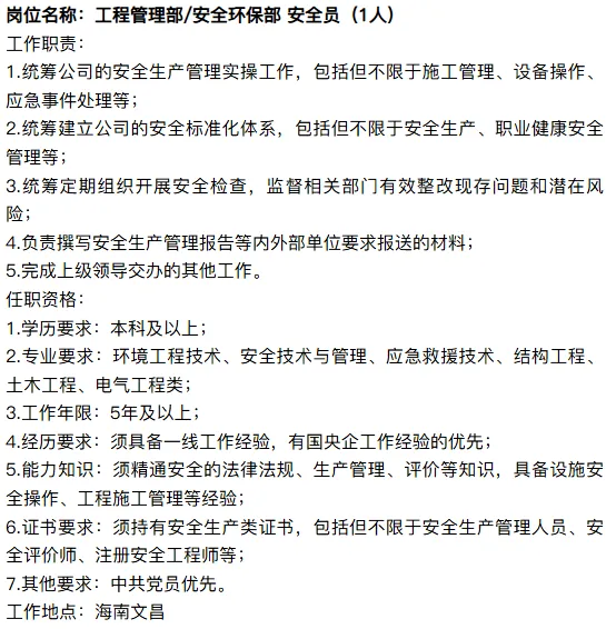 岗位名称:工程管理部/安全环保部 工程管理(1人)