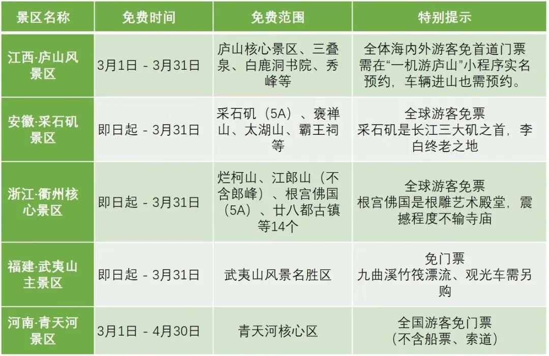 四川:阿坝州叠溪松坪沟(至3月31日,全体免票);巴中光雾山(至3月10日,对所有学生免票)。