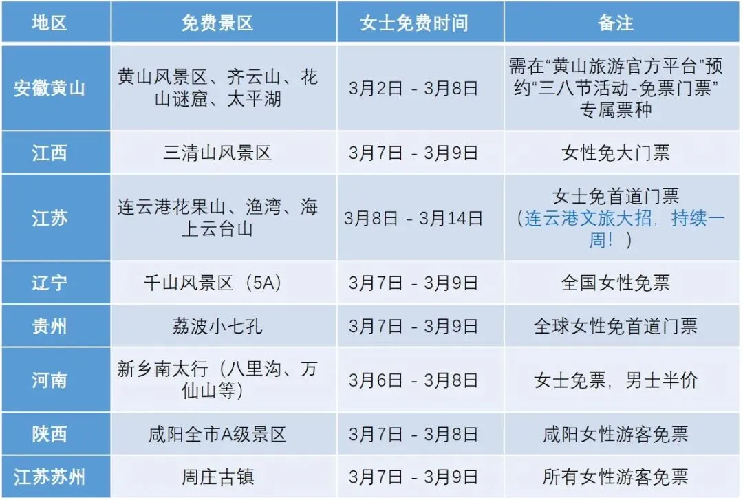 3月8日前后一周,是全国女性旅游福利最集中的时段。以下景区女士全免,男士通常半价或原价。