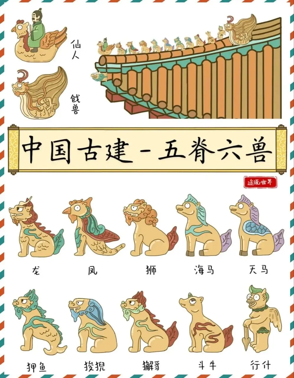 以最重要的太和殿为例,它的屋檐上足足蹲着十只神兽——这是全中国古建筑中的最高规格(普通建筑最多九只)。领头的是一位骑着凤凰的“仙人”,后面依次跟着龙、凤、狮子、天马、海马、狻猊(suān ní)、獬豸(xiè zhì)、斗牛、行什(háng shí)。